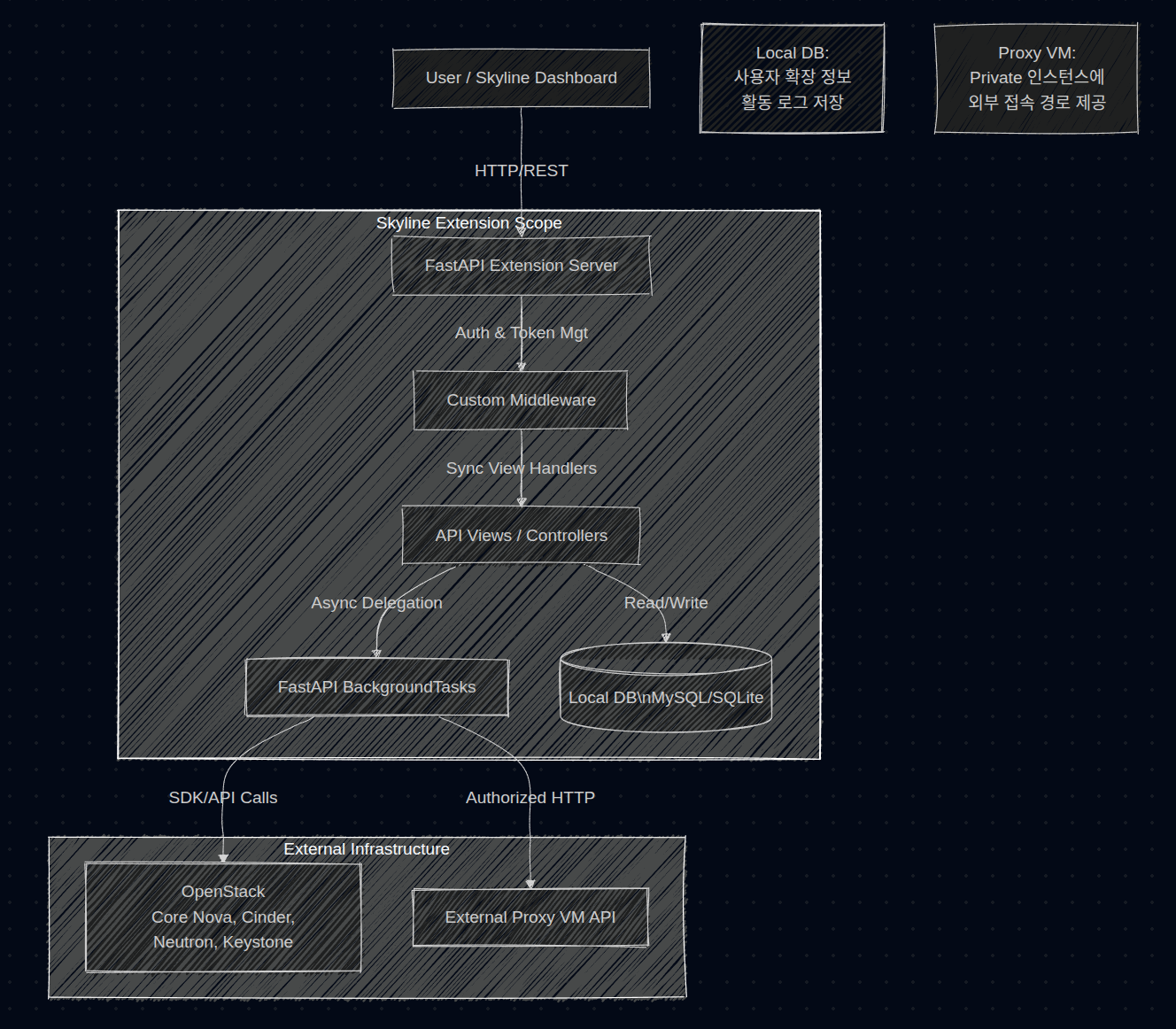 이제 서버와 오픈스택까지 구축을 했으니 이제 저희 상황에 맞게 수정을 해야하는데 이렇게 되면 개발기간이 너무 소요가 되기 때문에 OpenStack Skyline 대시보드의 기능을 보완하고 플랫폼 특화 기능을 제공하기 위해, FastAPI 기반의 독자적인 확장 백엔드(Skyline API Server Extension)를 구축했습니다.