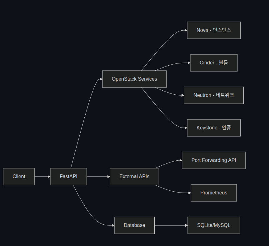 일단 먼저 크게 오픈스택의 기존 서비스들을 건지 않기 위해 중간에 FastAPI을 중계자 느낌을 두고 오픈스택의 서비스 와 연동을 하게 했습니다. 이렇게 한 이유는