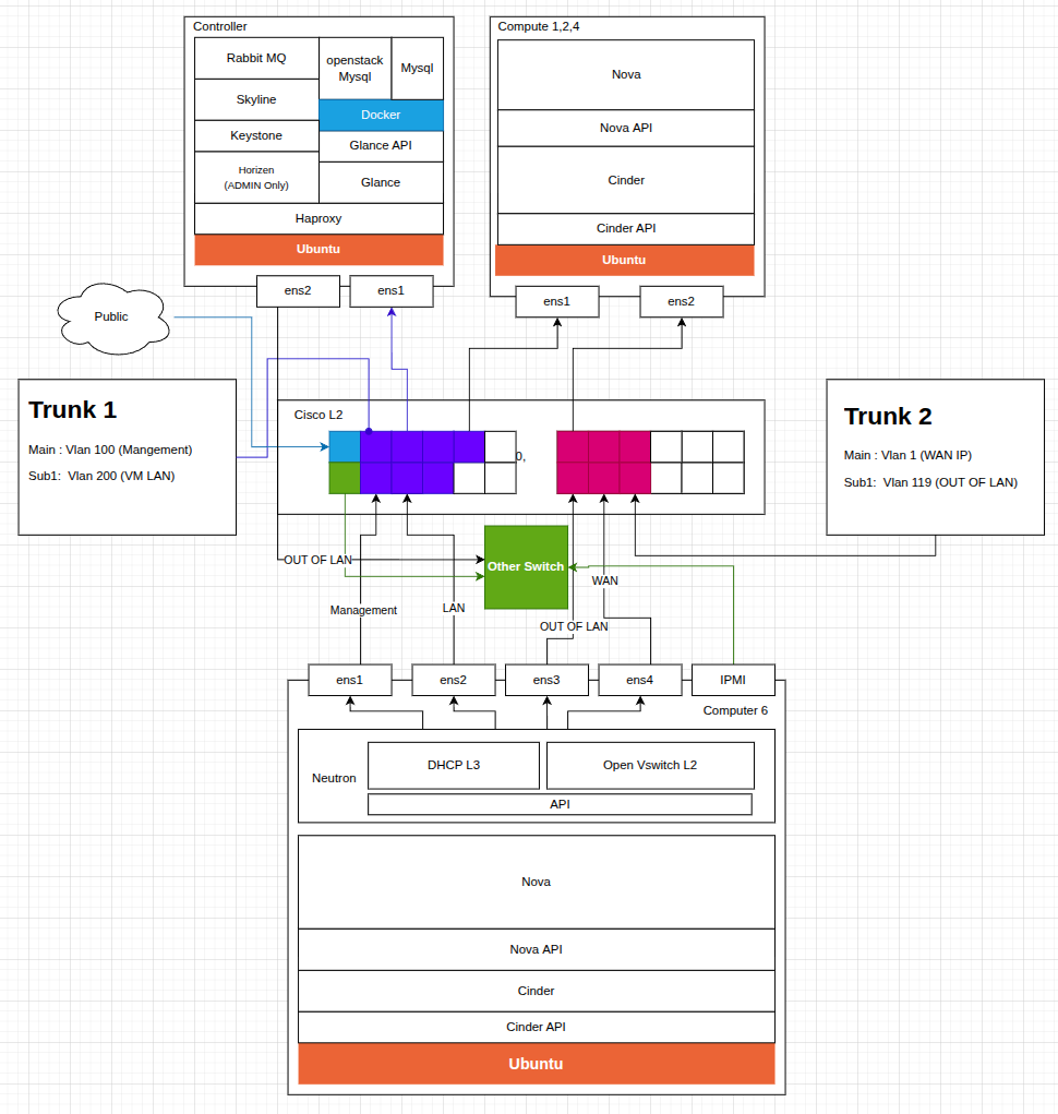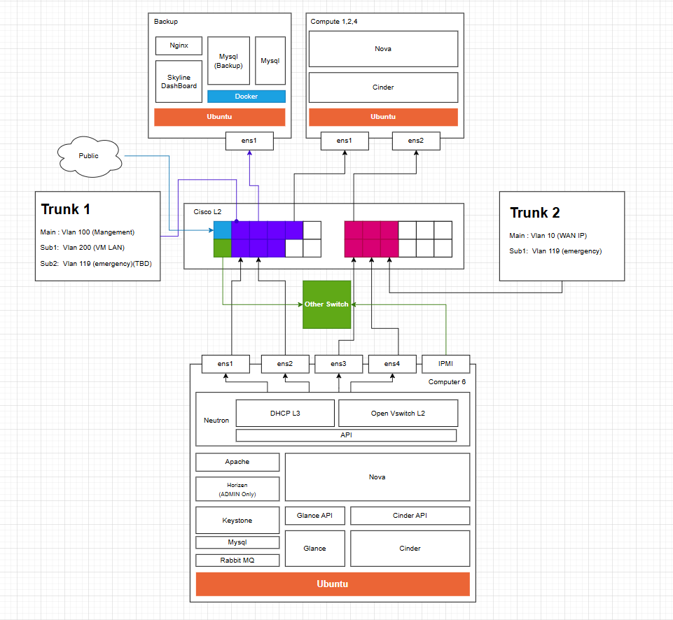 원래는 오픈스택을 이용해서 개발을 하려고 우측에 있는거 처럼 아키텍처을 설계를 했지만 우측에 설게한것은 네이티스(Native)으로 설치하는걸 가정을 그렇기 때문에 이렇게 하면 시간이 부족한 가운데 너무 시간이 소요될거 같아 좌측처럼 kolla-ansible을 써서 오픈스택을 설치하는 방안으로 설계를 다시했다. 그 이유는